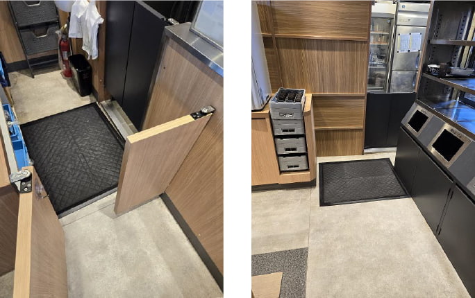 フロアだけでなく、通路、エレベータまで持ち出し、油汚れや黒ずみを起こすこともある。