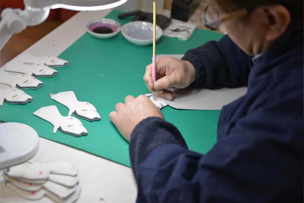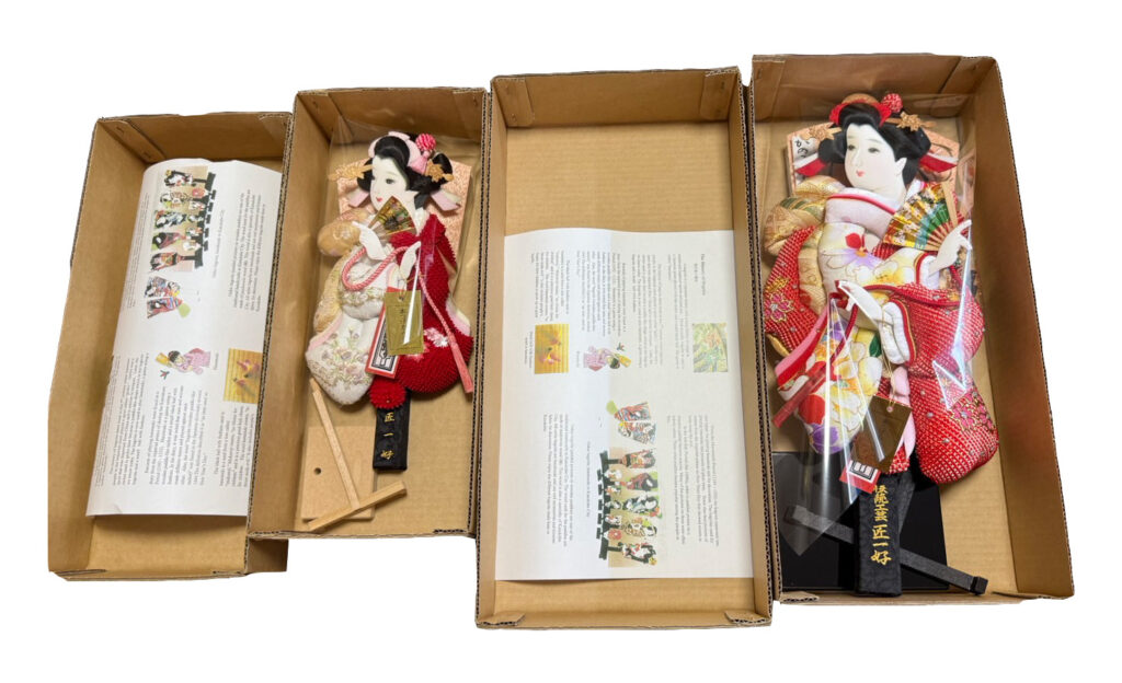 押絵羽子板の着物は左右別々の生地から製造でき、匠一好ブランドでは、お顔を最も輝かせる生地を選定し、1からオリジナルの製品をお作りしております。